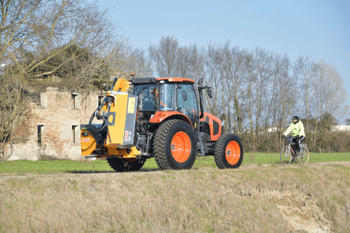 Portée horizontale : 4,82 m. Pièces d'articulation estampées moulées. Axes traités montés sur bagues bi-métal. Système anti basculement. Suspension oléopneumatique. Pivot arrière 115°. Groupe de broyage 1,25 m TNIT avec entraînement par courroies, équipé de couteaux polyvalents. Refroidisseur d'huile de série. Commande électronique progressive EG-Tronic avec gestion électrique du rotor.