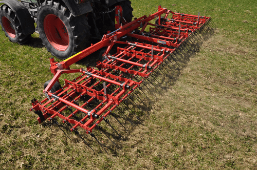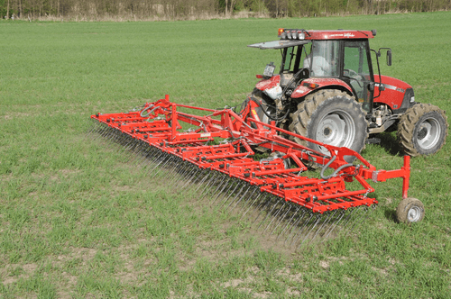Dents individuelles de 7 mm, jusqu’à 530 mm de passage (pour culture haute et buttes), réglage hydraulique de l’agressivité (jusqu’à 6 kg de pression par dent), châssis fermé qui s’adapte parfaitement au sol, repliage facile, silencieux même à vitesse élevée. Largeurs de travail de 2 m à 15 m. Choix d’équipements en option.