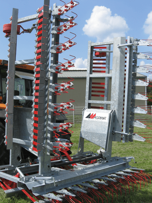 - 1 - RASETTES ET REGENERATEURS DES PRES : châssis entièrement galvanisé à chaud, assemblage mécanosoudé de tôles haute résistance pliées à froid, repliable grâce à un vérin hydraulique double effet, hauteur des dents étrilles réglables, et différents équipements de série en fonction du modèle.