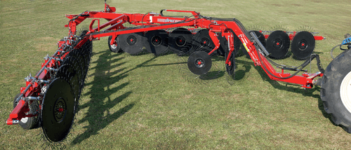 Andaineur central 2 rotors avec largeur de travail de 7,60 à 8,60m réglable hydrauliquement. Triple tandems...