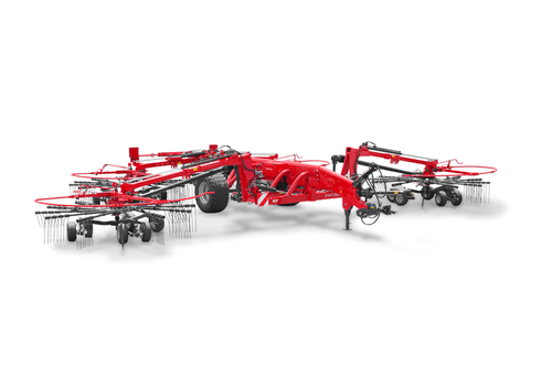 Andaineur central 2 rotors avec largeur de travail de 7,60 à 8,60m réglable hydrauliquement. Triple tandems...