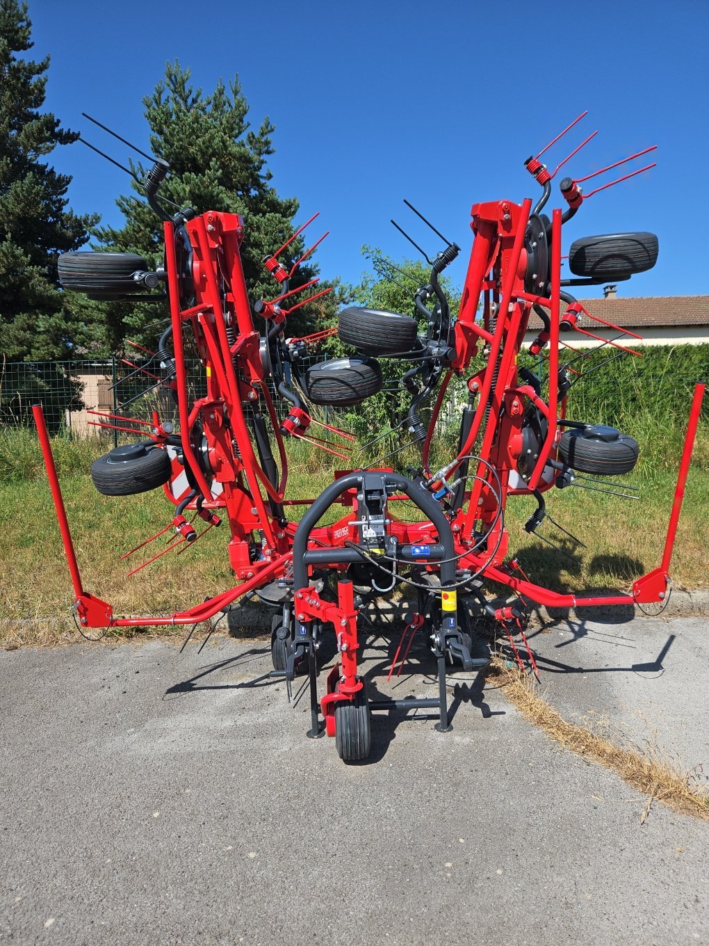 Faneuse portée 7,85 m de travail. 8 toupies, 5 bras, dents sur ressort en acier SUPER C. Accouplement...