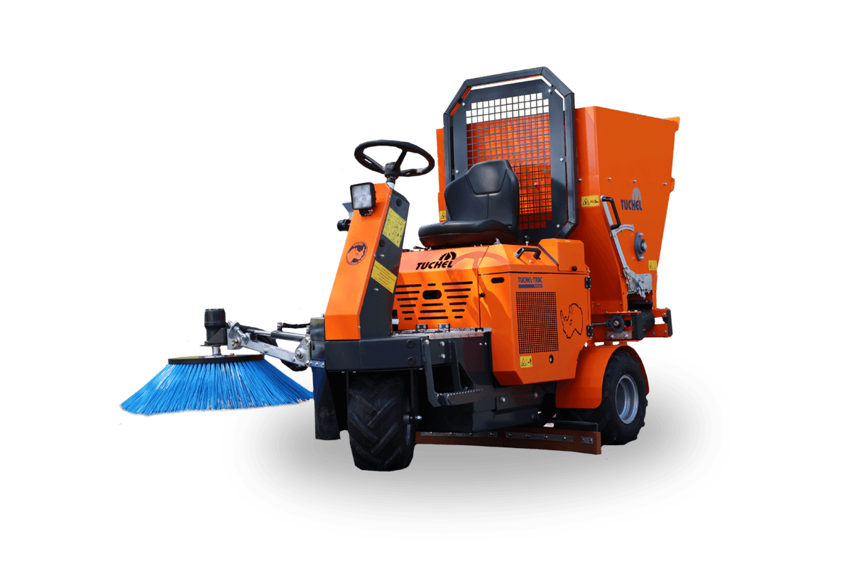 Moteur diesel Kubota 14cv, entrainement par les 2 roues arrière, dirigeable par la mono roue avant. Phare de travail, racleur relevable 1.2m placé sous le véhicule, cuve arrière de 900L avec convoyeur droite/gauche à vitesse variable. Brosse de balayage 850mm repliable. Disponible selon point de vente.