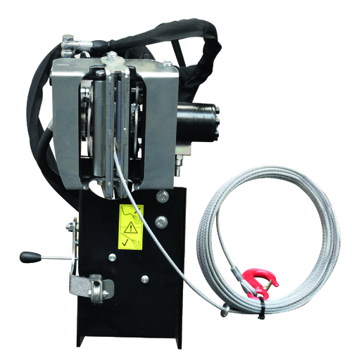Commande mécanique, force de traction 600 kg, 20 m de câble Ø 6 mm. Fin de course hydraulique, vitesse moyenne d'enroulement 0,5 m/s. 60 kg. Se monte sur les fendeuses SCAR