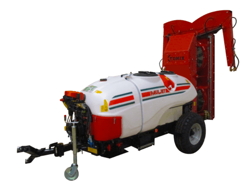 Cuve lave-main et cuve rince-circuit, indépendantes et incorporées. Pompe à membranes ou à pistons pour des débits de 90 à 140 L/min et des pressions de 1 à 50 bar. 2 turbines nylon à 10 pâles orientables Ø 760 mm à aspiration inversée. Boîte de vitesses à 2 vitesses et neutre, embrayage centrifuge. Puissance requise : 70/90 cv.