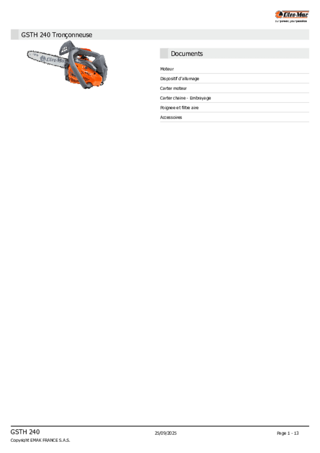 Vitesse de chaîne 22,9 m/s à 12500 tr/min.