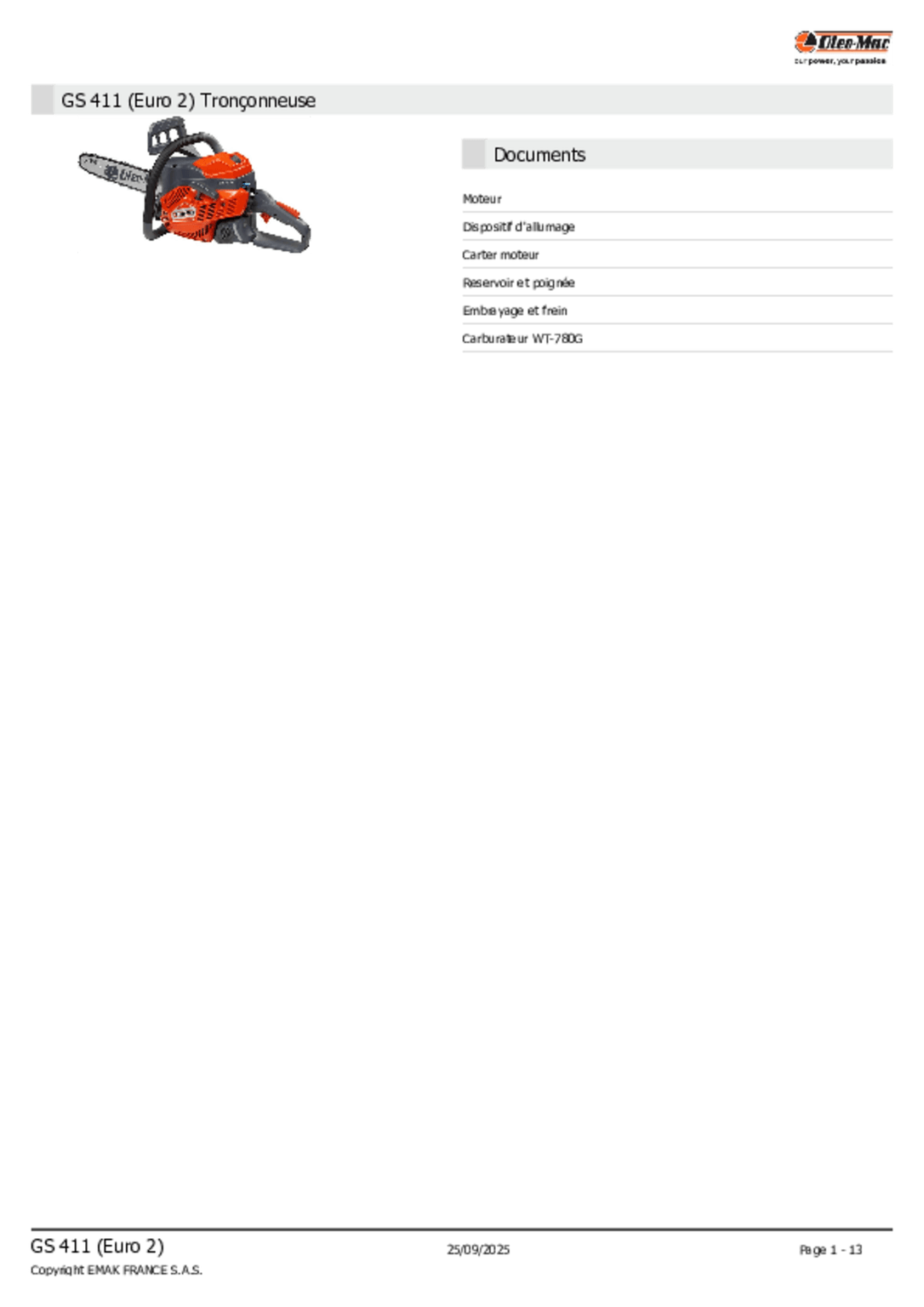 Tronçonneuse thermique pour travaux intensifs. GS 451. Moteur Emak. Cylindrée 42,9 cc. 1 cylindre 2 temps...