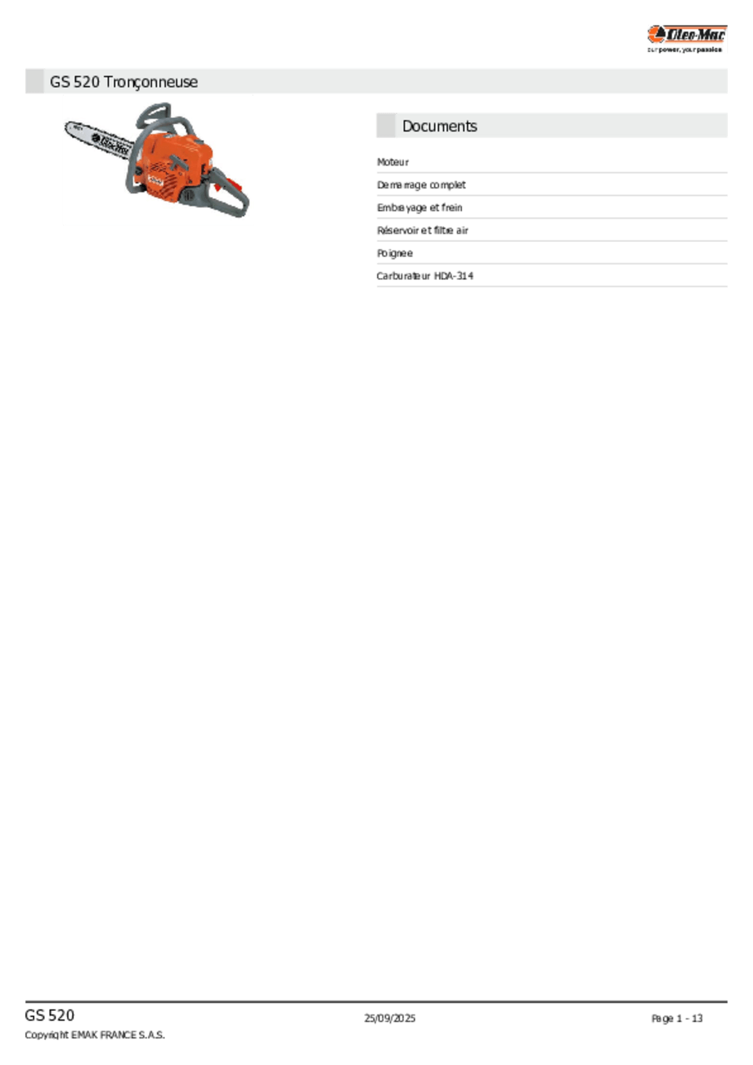 Tronçonneuse thermique pour travaux intensifs. GS 411. Moteur Emak. Cylindrée 39 cc. 1 cylindre 2 temps...