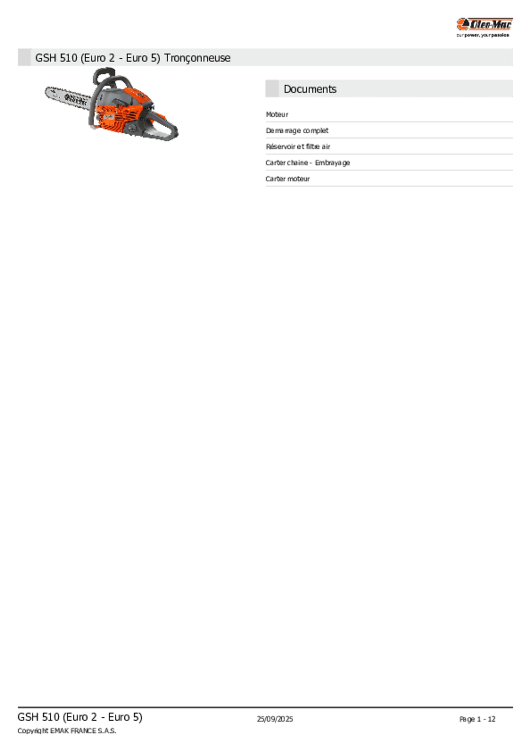 Tronçonneuse thermique pour travaux intensifs. GS 451. Moteur Emak. Cylindrée 42,9 cc. 1 cylindre 2 temps...
