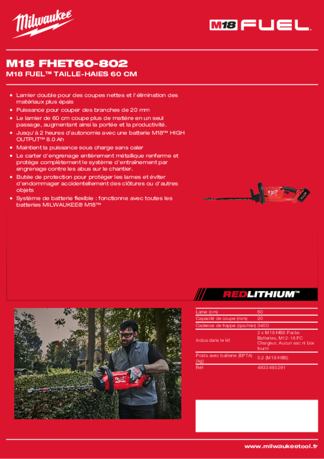 Taille haie à batterie. M18 FHET60-802. 2 Batteries 18 V 8 Ah. Cadence de frappe : 3200 cps/min. Capacité de coupe : 25 mm. Espacement des dents : 32 mm. Lamier : 60 cm doublement affuté et à double action. Poignée rotative à 5 positions. Livrée avec : 2 batterie 8 AH FORGE, 1 chargeur. Poids 4,1 kg