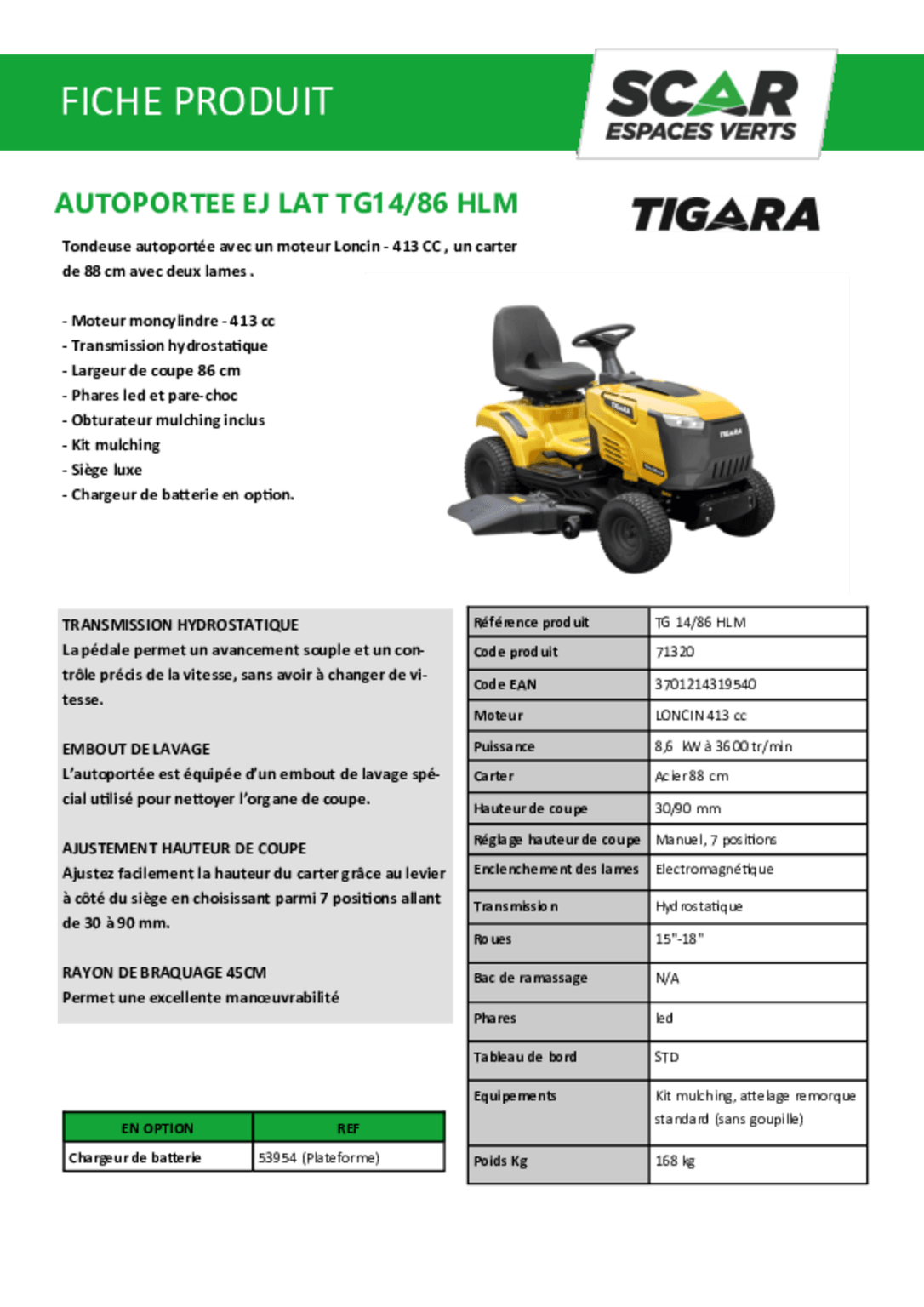 Autoportée éjection latérale. TG 13/74 HLM. Moteur Loncin. Cylindrée 352 cc. Puissance 7,2 kW à 3600...