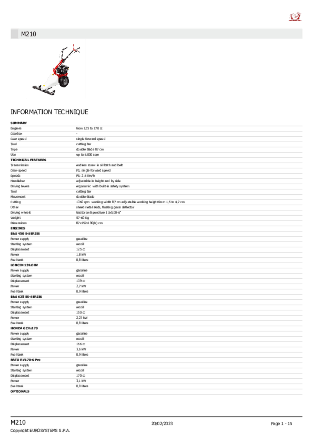 Moteur Pubert R80. Cylindrée 78 cc. Puissance 1,4 kW à 3600 tr/min. Largeur de travail 380 mm. 1 vitesse...