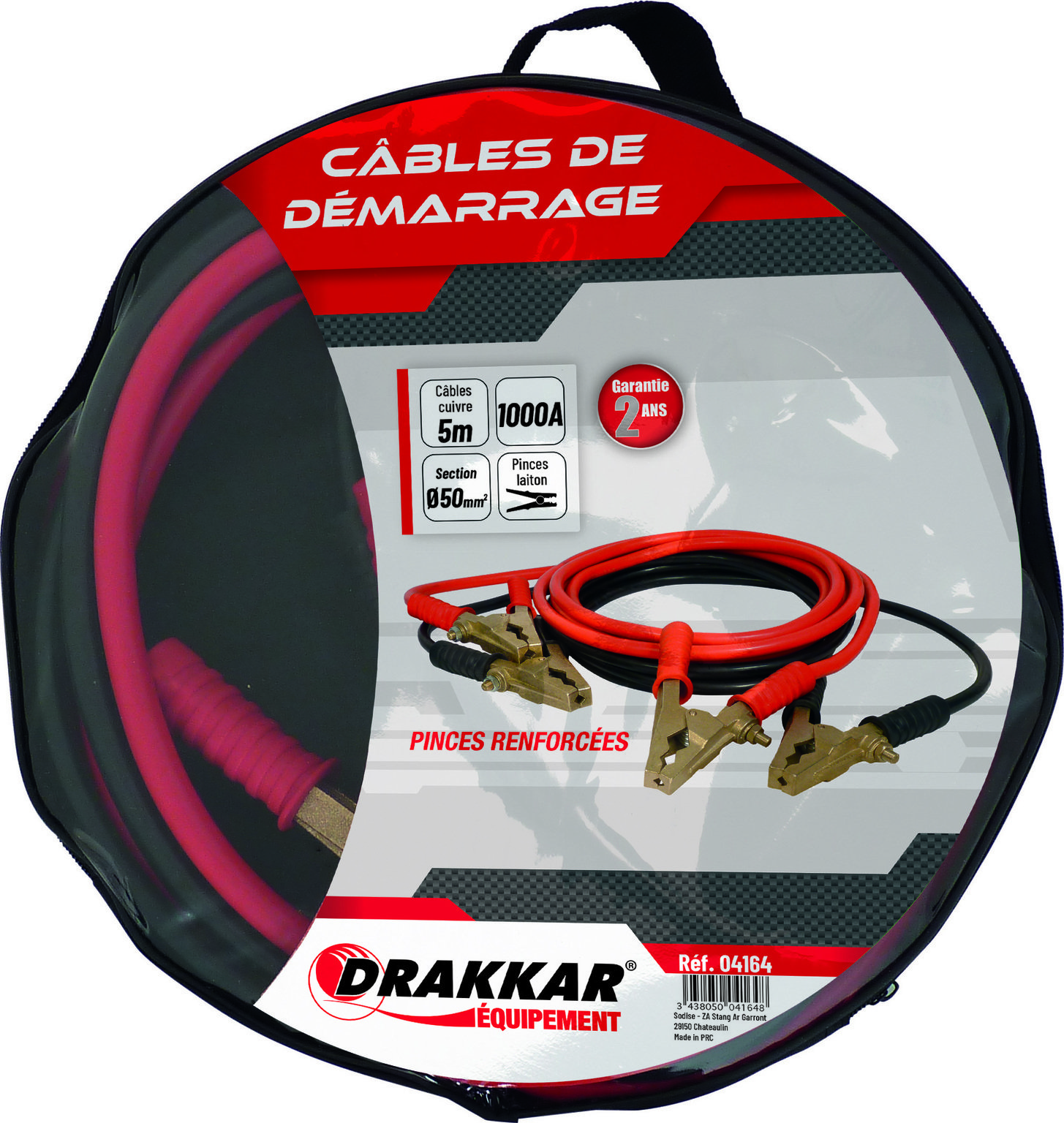 Câble de démarrage 1000 A. Câbles noirs et disjoints. Manchons couleur rouge/noir. Pinces laiton pur,...