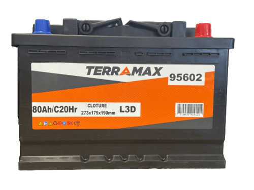 Batterie de clôture. Décharge lente. Tension : 12 V. Capacité : 80 Ah. Dimensions : 278x175x190 mm. Bornes : longueur. Polarité + : à droite.