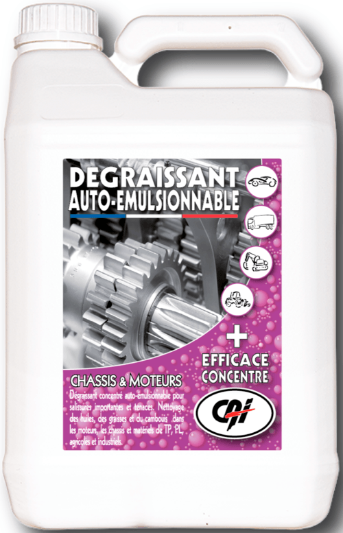 Nettoyant-dégraissant auto-émulsionnable concentré. Pour le nettoyage et dégraissage à froid de moteurs, chassis, ensembles mécaniques fortements souillés. Pour l'élimination des graisses, huiles, cambouis, résidus graisseux, bitûmes, goudrons, souillures de gazole ou de fioul. Utilisation : en émulsion, 1 volume de dégraissant pour 5 à 10 volumes d'eau. Rinçage à l'eau. Bidon 5 L.