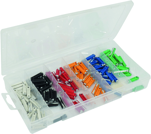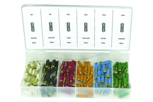 Coffret plastique de 120 fusibles enfichables standards assortis. Fusibles : 20x5A, 20x10A, 20x15A, 20x20A,...