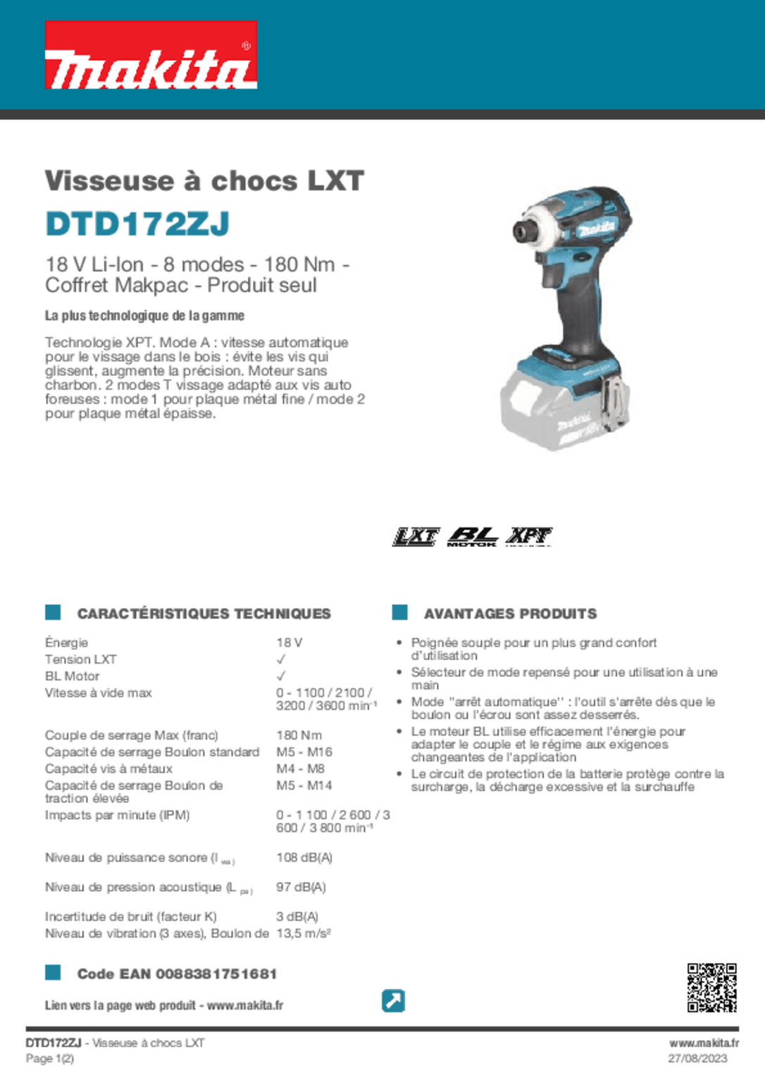 Visseuse à chocs 18V 180 NM DTD171ZJ