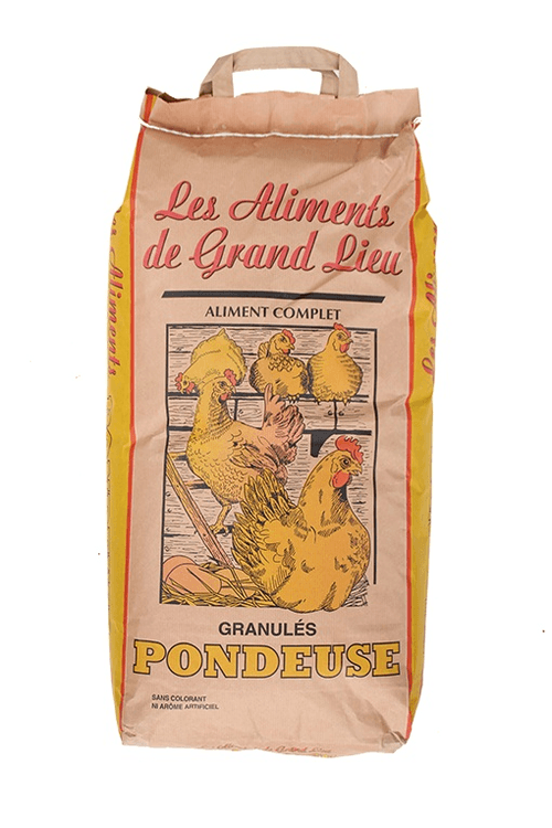 Aliment complet pour poules pondeuses. Composition : tourteaux d'extraction de tournesol, petites graines...