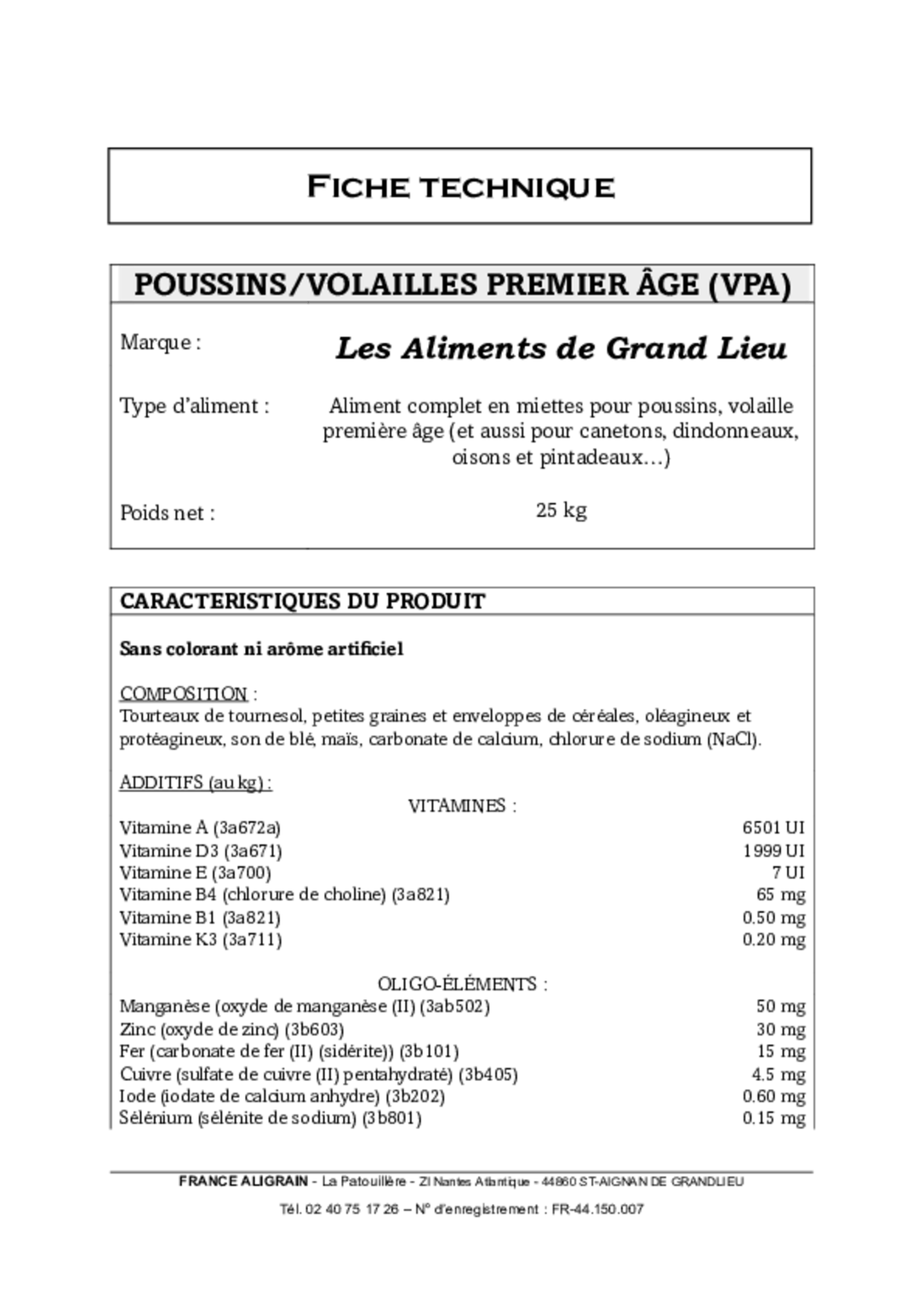 Aliments complets poussin 1er âge 25 kg