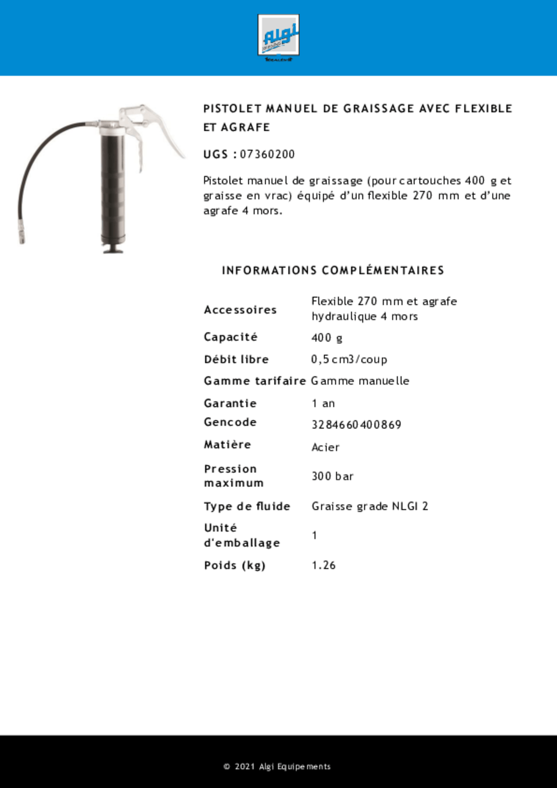 Flexible en polyamide, long. 300 mm, agrafe 4 mors. Tête de pompe en aluminium. Débit : 0,8 cm³/coup....