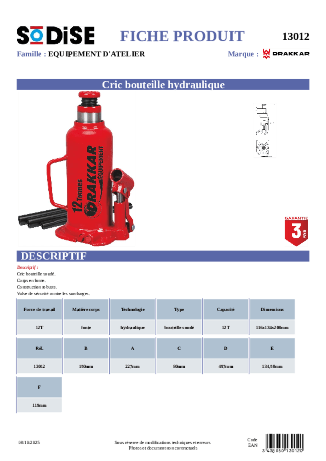 Cric hydraulique 3T. Hauteur minimale : 130 mm. Hauteur maximale : 465 mm. Fonction de levage rapide...
