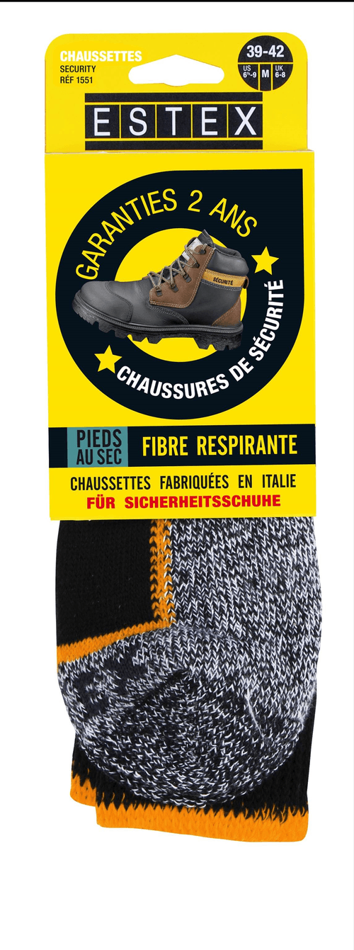 Chaussettes adaptées aux chaussures de sécurité. 58 % coton, 22 % polyester Coolmax, 16 % polyamide, 4 % polyamide Cordura. Pointures du 39/42 à 43/46.