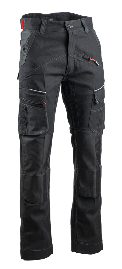 Multi poches stretch. 68% coton, 30% polyester, 2% élasthanne 300g/m2. Ceinture 4 passants resserrable sur les côtés par patte avec élastique et réhaussée dans le dos. Nombreuses poches dont des poches genouillères double position en oxford. Renforts entrejambes devant et dos, renforts bas de jambes au dos en oxford, triples surpiqures. Noir.