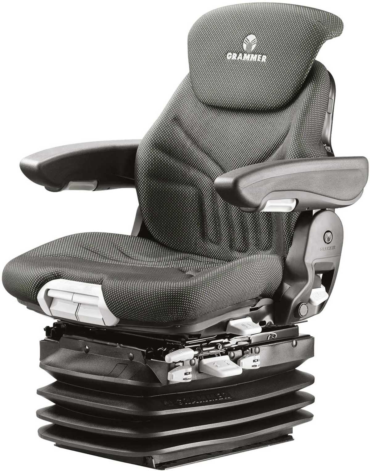Suspension pneumatique 12 V basse fréquence. Revêtement tissu. Largeur coussin assise 530 mm. Avec accoudoirs.