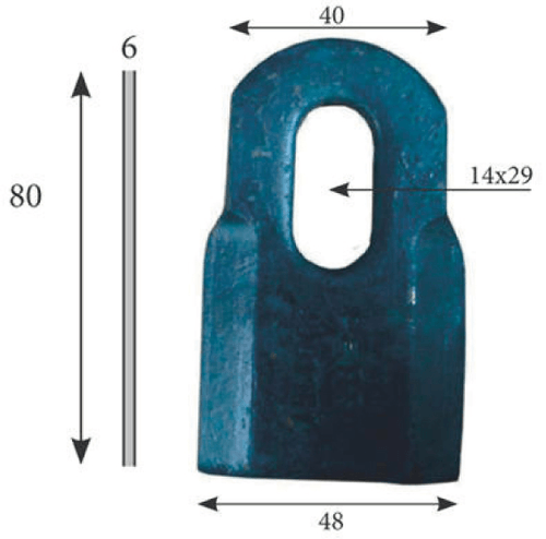 Longueur : 80 mm. Largeur 1 : 40 mm, largeur 2 : 48 mm. Epaisseur : 6 mm. Diamètre trou : 14x29 mm. Pour Tim.