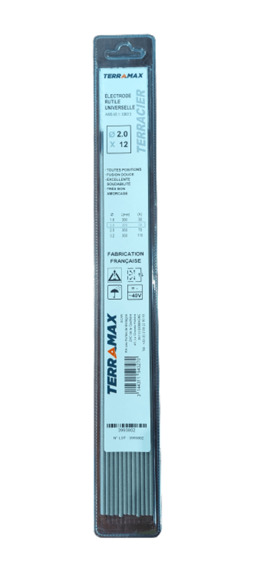 Electrode spéciale acier. A enrobage rutile. Universelle, polyvalente. Diamètre : 2,5 mm. Longueur :...